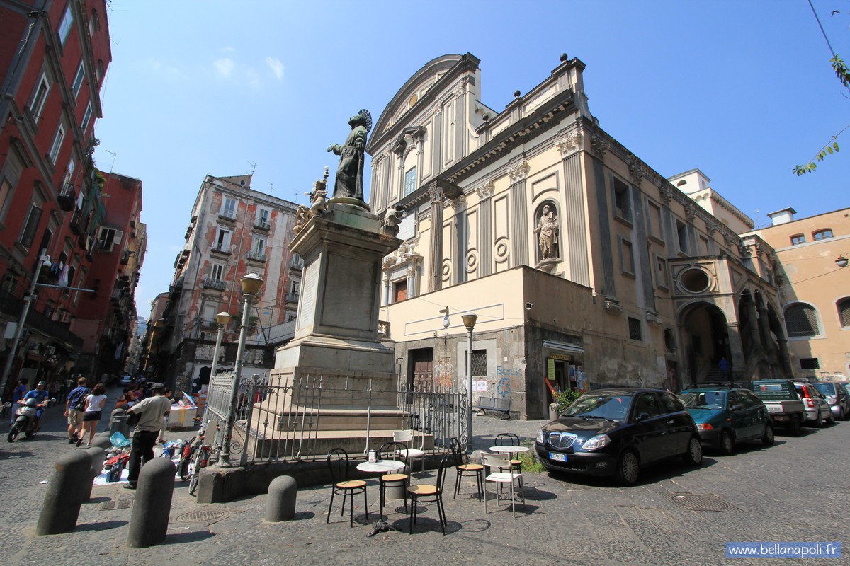 Au centre de la place s'élève une statue en hommage au saint, dont l'histoire fut mouvementée : Naples, qui compte quatre guglie, faillit en effet en avoir une cinquième.